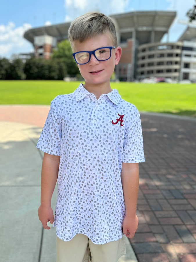 92% Polyester/8% Spandex Adorable performance polo offers sophisticated style and is a must-have Features: -3-button placket - Moisture wicking - Tag-less - 4-way stretch - Officially licensed Small (Ages: 5-6) Medium (Ages: 7-8) Large (Ages: 9-10) X-Large (Ages: 11-12)