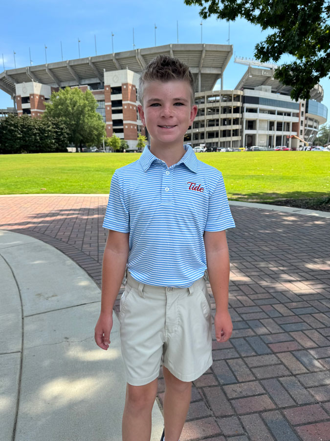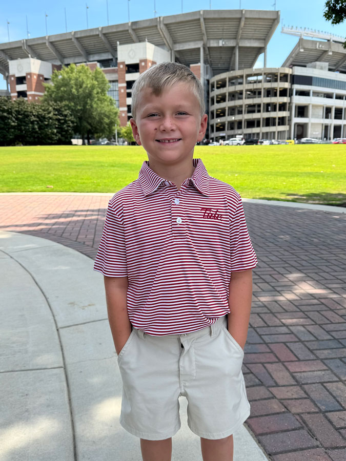 100% Performance polyester 3-Button placket Moisture wicking Yarn dyed interlock stripe 2T (Ages: 1-2) 3T (Ages: 2-3) 4T (Ages: 3-4) 5T (Ages: 4-5) Small (Ages: 5-6) Medium (Ages: 7-8) Large (Ages: 9-10) X-Large (Ages: 11-12)