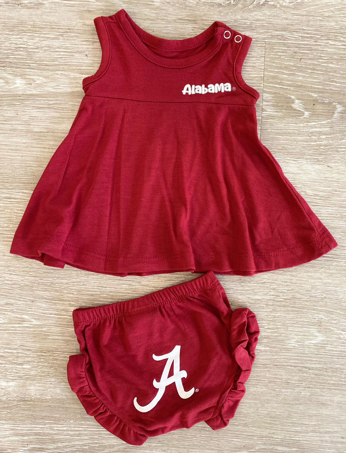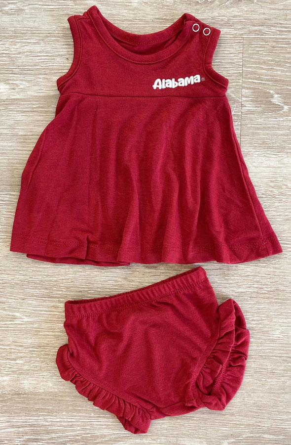 Machine Wash Cold/ Tumble Dry Low Tank Top Sporting a small "Alabama" at the top and snaps on the shoulder to make getting on easy! The bottoms of this set are precious as they have ruffles on each leg and a big Script A on the bottoms.